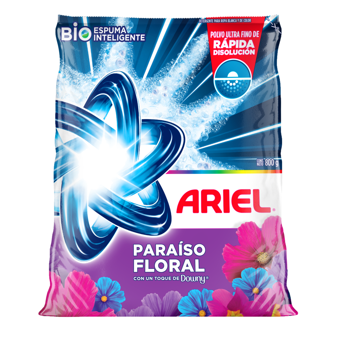 Ariel Paraíso Floral es un detergente (líquido y en polvo) que combina limpieza profunda contra manchas difíciles con una intensa y duradera fragancia floral inspirada en Downy. Ofrece acción rápida, cuida colores, elimina malos olores y viene con tecnología de disolución avanzada para ropa impecable